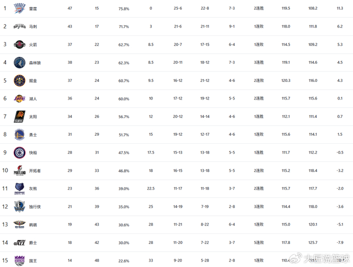 受困于伤病问题,雷霆联盟第一的位置被活塞队夺走,但这并不影响他们继续坐稳西部第一的位置,尤其是亚历山大回归后,雷霆队一波2连胜反弹势头明显。